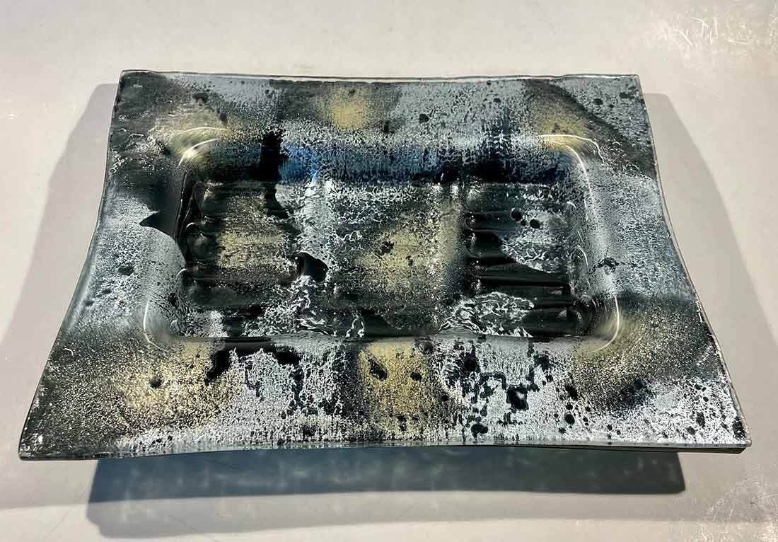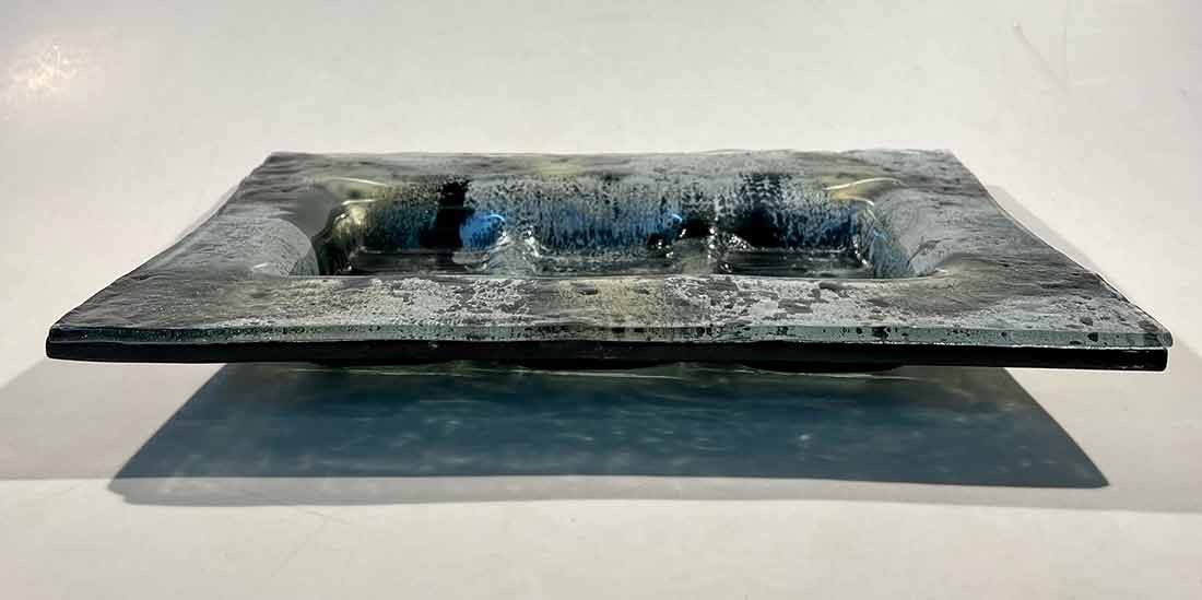 Float glass 10mm thick, painted with metallic glass colors, in between two sheets of glass and kiln fired on handmade, one use mold. Each piece is unique.